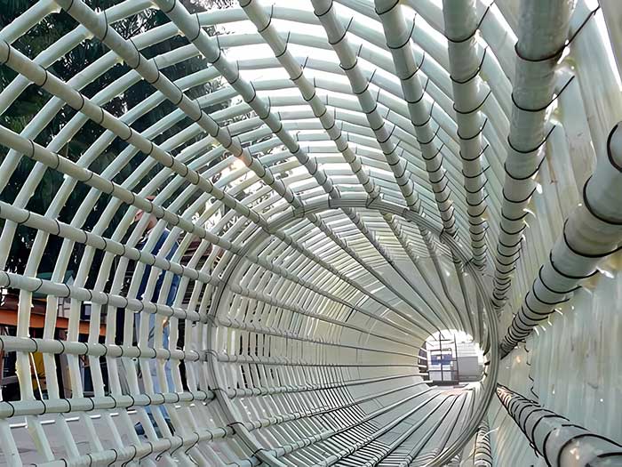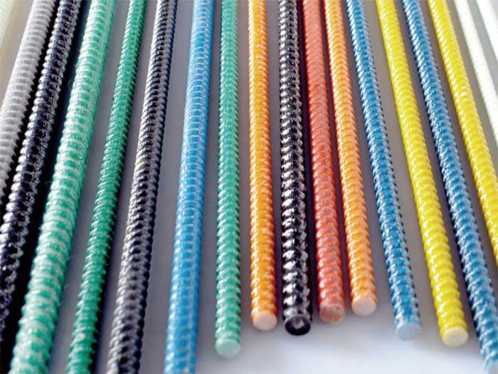 玻璃纤维筋由高性能树脂材料(UPR、 VER、 EP、PU)与高强度纤维(GF、 BF、 CF) 通过拉挤工艺复合而成,具有比重轻、高强度、耐腐蚀、易切割等特性。